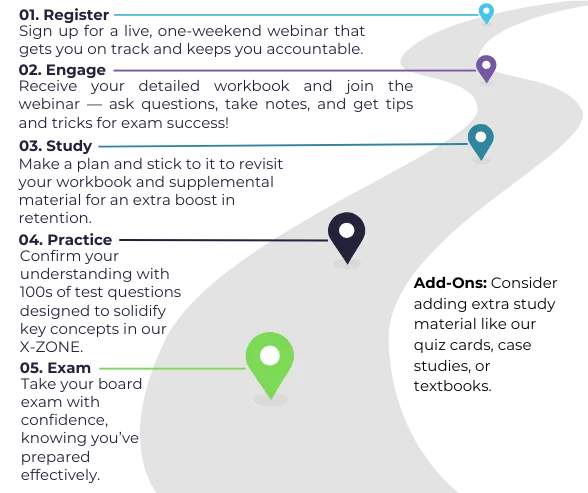 To solidify what you learn in the webinar and your course workbook, you need to challenge yourself with practice questions. X-ZONE is our online platform that contains the practice questions for each course. You will have 9 months from the date of your registration to activate X-ZONE. Once activated, your 6 week subscription will begin.